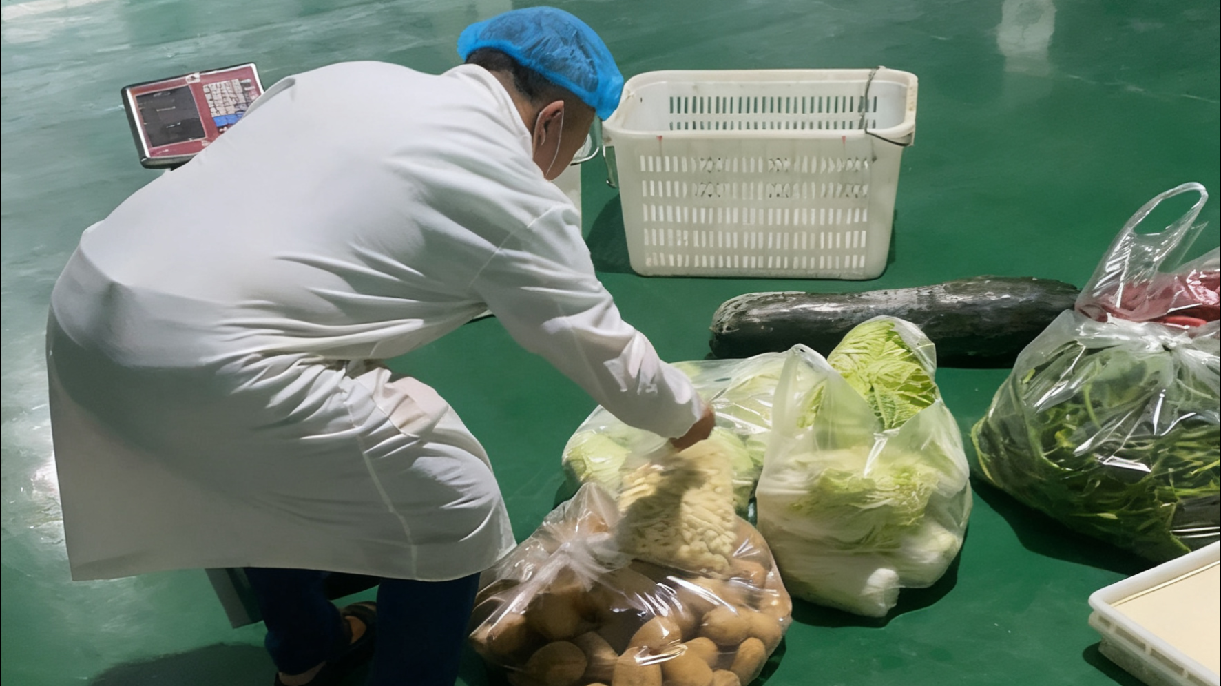清晨即起,嚴(yán)把安全關(guān)卡。10月3日早上6點(diǎn),天光未亮,中心倉(cāng)已是燈火通明。倉(cāng)庫(kù)門(mén)口,工作人員正對(duì)首批送達(dá)的蔬菜執(zhí)行嚴(yán)格的“到貨四步法”:稱(chēng)重核斤兩、觀色辨新鮮、溯源查憑證、記錄保精準(zhǔn),確保每一份食材從源頭就符合標(biāo)準(zhǔn)。